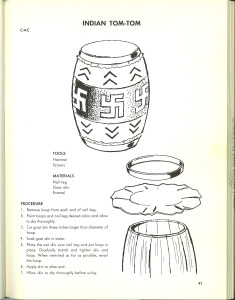 Some librarian spies from the west sent along this wonderful title to ALB. I am not quite sure of the craft on the front, but the spies sent along a page featuring this ultra cool Indian tom-tom craft. A quote from the cover blurb: “This book is written primarily for teachers and for parents whose youngsters have come into the world with less potential than the so-called ‘average’ child.” Submitters say: “What better way to raise a child’s potential than by teaching him or her to stretch a goat skin to make a drum, then paint swastikas on it?”