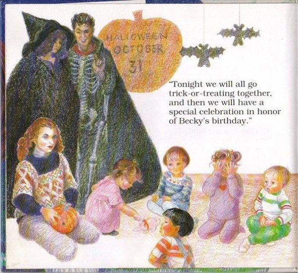 Holly: This is unbelievable. There is truly a book for every subject, isn’t there? Well, if your community has a problem with satanic rituals, this might be a great choice for your children’s section. Can you imagine a child stumbling upon this: “Mommy, I want THIS one!” Story time on the dark side. Oh, I wish I could post more pages. Truly unbelievable. Crying, naked children standing in the woods in a circle being told that nothing can be told outside the circle and that their parents have given them to the hooded people…I may have nightmares from this one. Are you supposed to read this to traumatized children after they’ve been part of a satanic ritual? It’s not comforting!