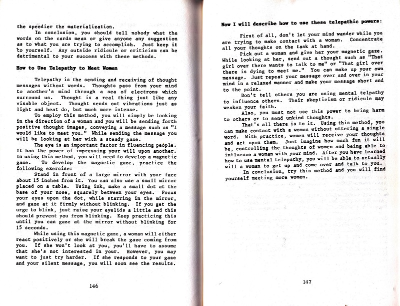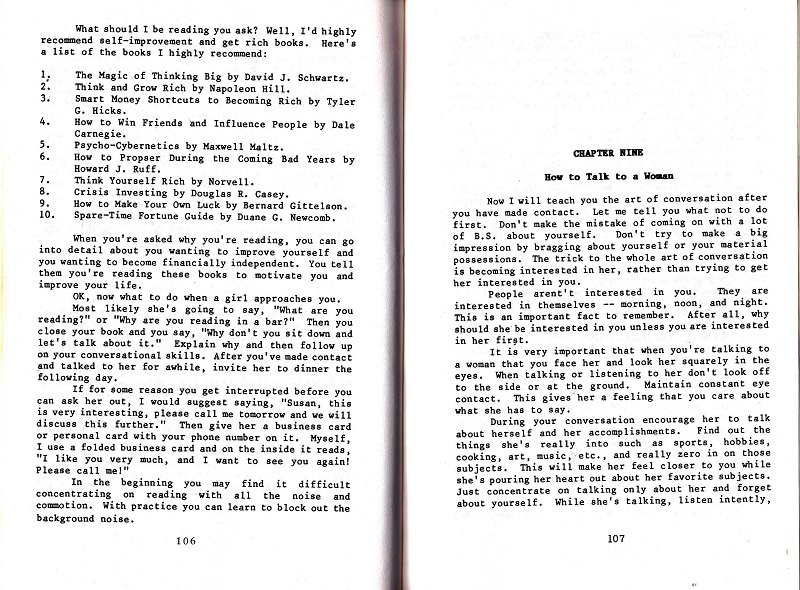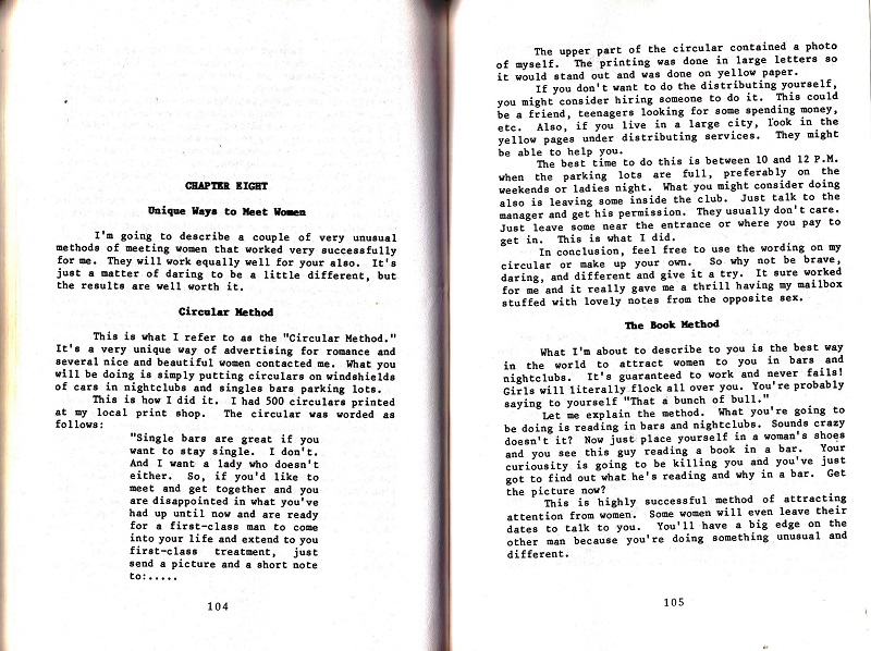 Submitter: The reasons it’s awful? Well….. first there’s THE COVER…. Another co-worker said he heard 70’s porn music immediately upon looking at it. And also it advocates date rape as a way to meet women (see pix of pages). It also has chapters on “using astrology to pick up women” and “using the powers of the mind” and advises all the great old standbys like asking a woman to rub suntan oil on you at the beach– with that carpet of hair like on the cover? Um…EW. And for those guys who “are tired of the liberated American women who are so busy trying to be equal to men that they have forgotten how to be ‘real’ women” there’s a chapter on how to find an Asian mail order bride.The SADDEST thing here? This was published not in the 1970’s, but in 1991. There’s even a website in the front– getgirls.com. And it’s…… special ……. too.