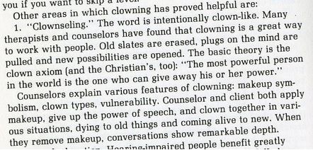 Submitter: This bizarre book includes makeup tips, skits based on Bible verses, and other odd ideas – I included scans of my two favorites, “clownseling” & Marriage enrichment. Thankfully for those scared of clowns, the library’s name label obscures most of the clown’s face on the cover.