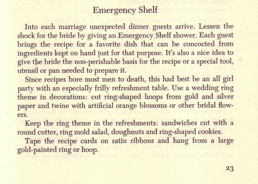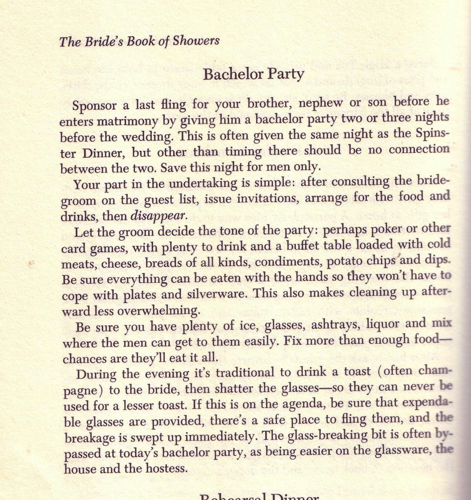 My idea for unexpected guests is ordering a pizza but this idea works well too. I am concerned that a bride would go into shock at such an event. Best part of this book: throwing your brother, nephew or son a bachelor party. I am curious on the etiquette of paying for strippers and such.