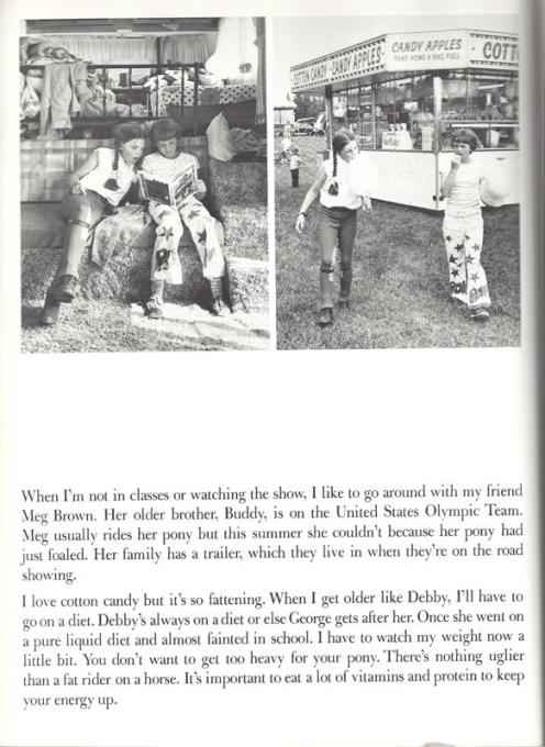“I love cotton candy but it’s so fattening. When I get older like Debby, I’ll have to go on a diet. Debby’s always on a diet or else George gets after her. Once she went on a pure liquid diet and almost fainted in school. I have to watch my weight now a little bit. You don’t want to get too heavy for your pony. There’s nothing uglier than a fat rider on a horse.”