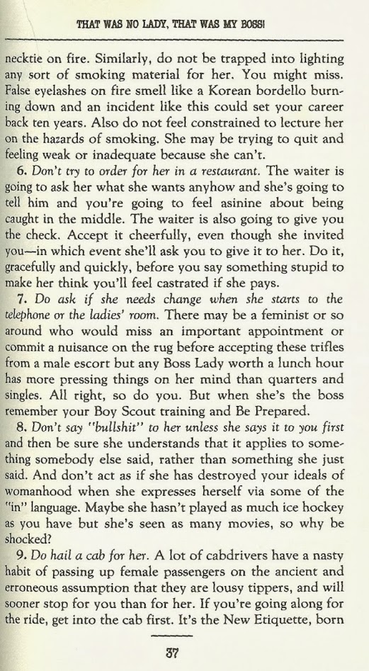 Holly: Even 1986 seems a little late for that advice. I’m confused by the title, though. Is this advice for the new boss lady or her subordinates?