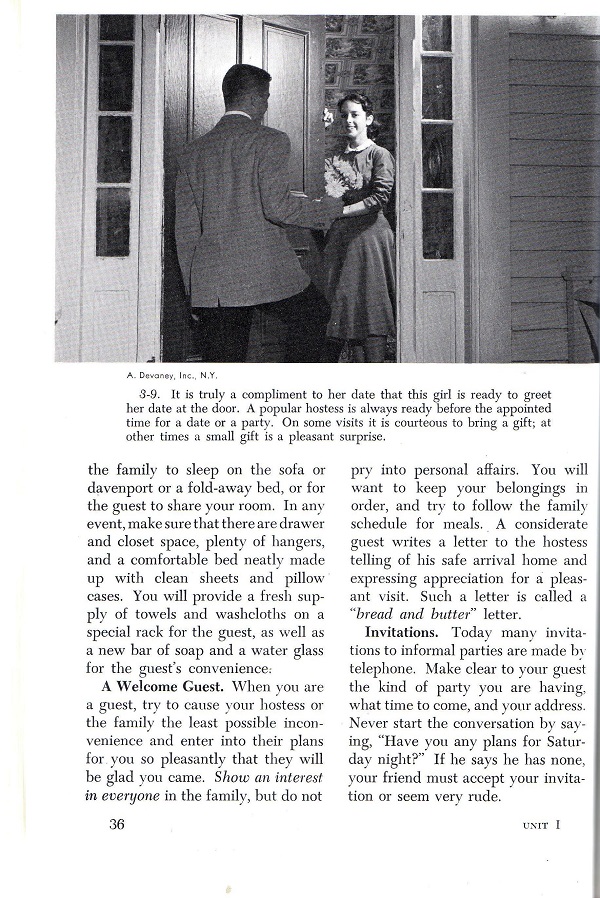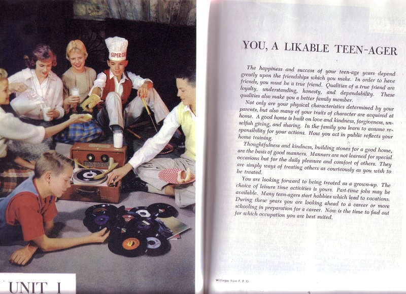 I was lucky enough to trip on it at our library’s used book sale. I have no idea how it ended up at our place, but it looks like it was a textbook refugee from a junior high school home economics class. (Do they still call it Home Ec?) There is actually a ton of interesting information here. A prune salad recipe (I wish that picture was in COLOR!), how to make a bed, home decorating, caring for the kids, etc.