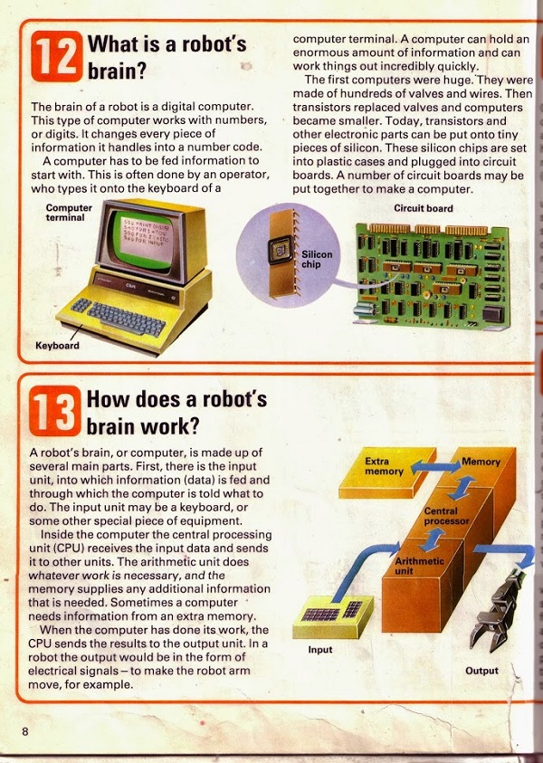 A 6 year old regular patron of mine once stated “you can’t have too many robot books”. True enough. However, I think we can safely let this one slide into the great beyond. Aside from the dirty cover and tape repairs, this book is just dated. I did like the content though. Any kid back in the 80s would have devoured this book. Today, though, it might just seem hokey and old fashioned. I figure that the kids would get the references to Star Wars, but how many kids would get the Bionic Man, Dr Who and Issac Asimov?