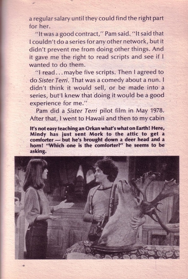 Who didn’t love Mork when he made an appearance on Happy Days and stole the show? I snatched this copy up at a book sale thinking surely no one will still have this in juvenile collection. Well I was wrong! A few school libraries and a handful of public still show holdings on this paperback. I gleefully paid for this late 70s gem and started to get a few scans going. The horror! I noticed that the pages seemed odd. Turns out this book starts on page 37 and then ends on page 75 in the middle of the book and once again, page 37-75 start all over again. I was robbed! No Robin Williams info just Mindy and her dad. My whole Mork and Mindy flashback is now tainted by bad book binding. That’s 2 dollars I will never see again. The horror! Mindy and her dad without MORK? That’s just WRONG!