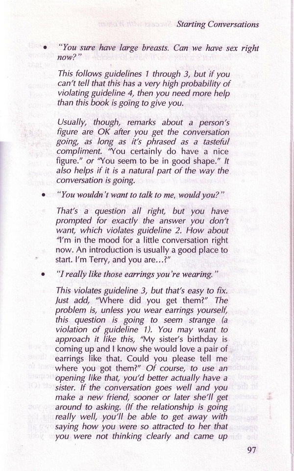 I just love when I find a good dating advice book. The librarian in me does appreciate the contact log and cataloging your conversations with women (with the requisite “room for improvement” section). I am sure a more modern version of this idea would be a cool searchable database complete with an app for your smart phone. Aside from my momentary cataloging rush, this poor dating book really feels like an employee performance review guide.