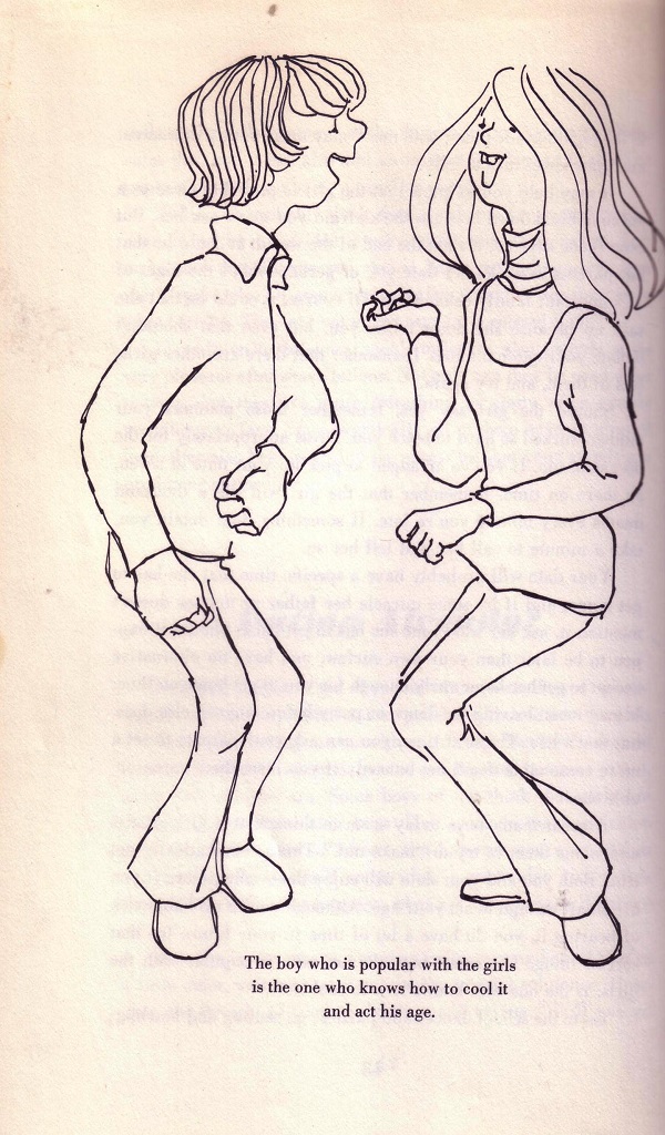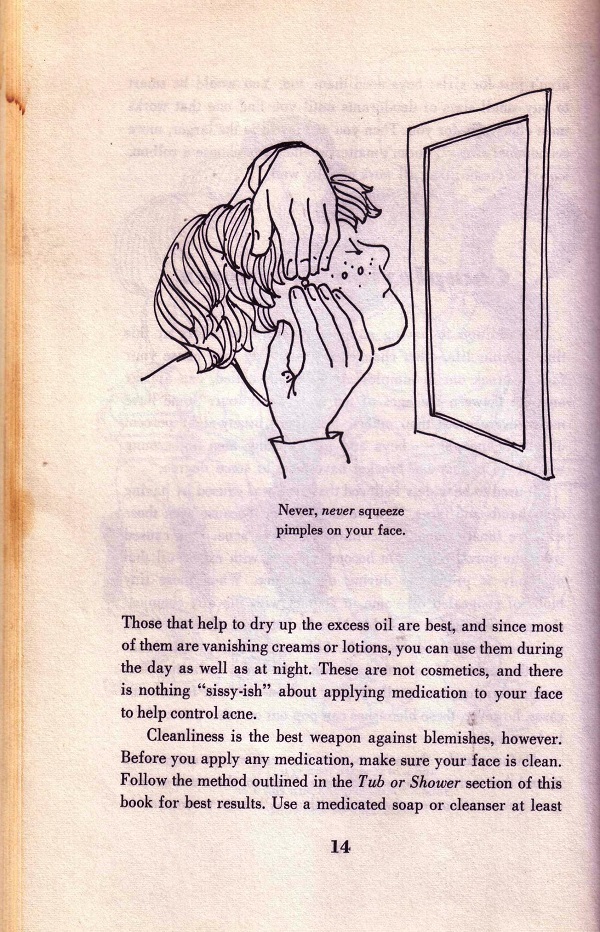 I am not even going to wonder what the librarian was smoking when they kept this on the shelf. I pray it is just one of those pathetic things that just falls through the cracks and not someone pathetically arguing “but some young man might need this!” (Insert a tirade here about GLANCING at a shelf list now and again for dated materials.) I am all for books on basic hygiene, but please can’t we do something a bit more current? Gotta love these instructive illustrations.