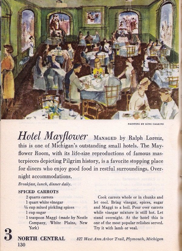 This wonderful book showed up in a library book sale and of course I grabbed it! I looked up some of the house specialties from Michigan. (I love the idea of going to Oscoda to eat Tuna Casserole.You would think they would feature one of the fish from Lake Huron as a specialty.) None of the places located in cities I was familiar with even registered on my radar with the exception of New Orleans’ Court of Two Sisters and Plymouth, Michigan’s Mayflower Hotel.