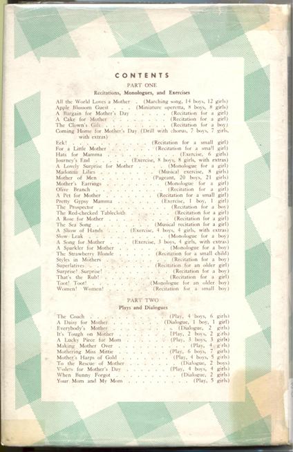 Inside is much, much worse. Apparently, Miss Casey loved the idea of Mother’s Day “lively plays and dialogues, recitations, monologues, and exercises.” There’s a publisher’s note on costumes: “the publishers of this book do not handle the crepe paper suggested for the costumes described in various exercises and plays. It may, however, be obtained at the stores of practically all towns of ordinary size throughout the country.” Crepe paper? LOL