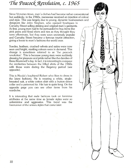 Submitter: This book was recently weeded from the adult non-fiction section of a public library. The inept drawings alone make it awful enough for inclusion (there isn’t a single photo), but the real hilarity is in the stories the author concocted around these fictional Londoners. Tim, for example, is feeling rather dejected as he shows us what the fashionable unemployed man was wearing circa 1975, while Nicola offers evidence that miniskirts in 1965 actually ended just above the knee. Her boyfriend, Robert, (whose hair is “quite long”) models the frills, florals, and bright, startling colors of the “peacock revolution” with his, um…plain white suit and plain white shirt. But his tie is patterned. That’s startling, right?