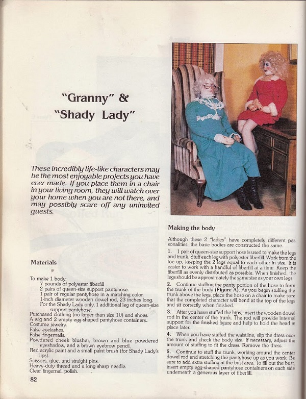 Perhaps I am not the best to judge a crafting book’s weed-worthiness, but I think this book is just this side of disturbing. Evidence is in the first picture below. I am certainly not putting life-size dolls in my living room. I don’t care if they are able to scare off “guests.” They are scaring me! Shady Lady and Granny? Really? I keep looking at these pair of dolls as a madam and one of her working girls. I am not even sure what to say about the footstool featured in the other picture.