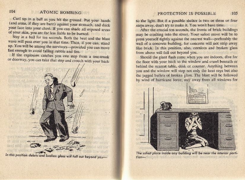 My generation was told that we could hide from nuclear holocaust from underneath our school desk. Fortunately, I never had the opportunity to see this safety tip in action. The absurdity of this material never ceases to amaze me. Take a quick minute to look at some of these pages. I really should have put the whole book up! I particularly like the advice about spying on your neighbors. Do it for America.