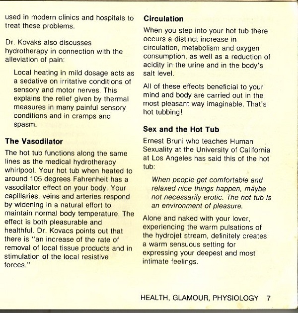Submitter: In actuality a fairly well done how-to book; the cover alone demands submission. You just KNOW that there are no bathing suits in evidence there – and is that Paul Simon third from the left?! Especially when reading the last sentence in paragraph two of “The Spiritual Community.” After all, ‘the hot tub is an environment of pleasure’.