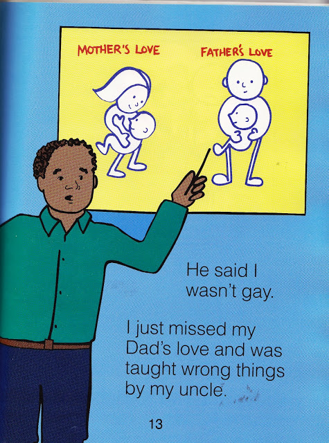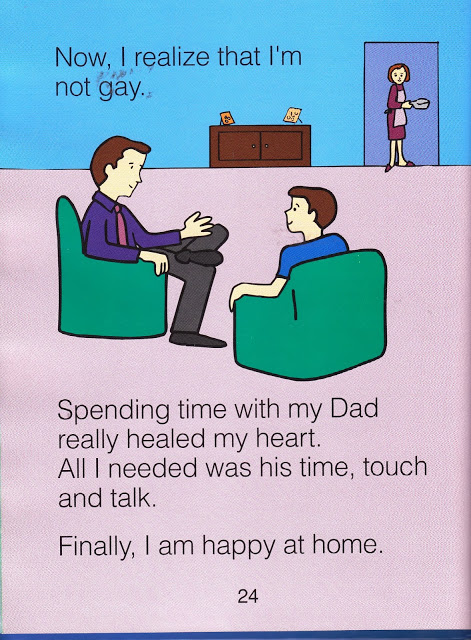 In this lovely story we have a boy named Alfie. His parents are fighting and his dad is always working. He also had a creepy uncle Pete come over and sexually abuse him. Naturally, Alfie wondered if he was gay. Fortunately, a school counselor said NO! and got Mom and Dad some marriage counseling. Creepy uncle Pete also got some undefined help. Now Alfie isn’t gay anymore! He has grown up and now has a wife.