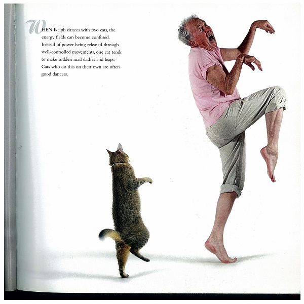 Holly: Is it a parody? Is it serious? We’re not sure. Worldcat’s summary seems pretty serious: “Photographs and text celebrate the joyous communication that can exist between humans and their feline companions as they engage in movement and dance together.” The Library of Congress in their wisdom gave it serious subject headings, too: Dance, Cats–Behavior, and Human-animal relationships. Either way, it’s funny! The cats are…dancing! Mary, can Roberta dance? It’s the people who are really funny here, though. I’m a little worried for Ralph, actually. He might be having a stroke.
