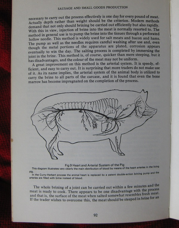 Submitter: A whole new world opened up for me on reading this book. Bits of it, I must admit, got under my skin and filled me with awe and wonder. It appears the word sausage is derived from the Latin ‘salsus’ meaning salted and consequently, preserved meats. I discovered rather unpleasantly sounding things like ‘bologna’ and ‘scrapple’. This latter product is of Dutch origin, though I read that it was common in the United States, where it enjoys great popularity as a breakfast dish, fried, preferably in deep fat. It seems that the English would not take to it unless the name was changed from scrapple to something like ‘Breakfast slice’ or ‘Wheatmeat’ to hide its rather unsavoury constituents. They are a lightly cured pigs head, pork rinds and blanched pork livers. However the wurst was yet to come in chapter 17 under the title of Utilization of Waste. It appears that the only part of a pig not used in sausages and small goods is its squeak, or grunt, depending on its age. All the rinds, trimmings and odd bits with strange names are rendered down into brawns, meat pastes and potted savoury spreads. Sounds awful.