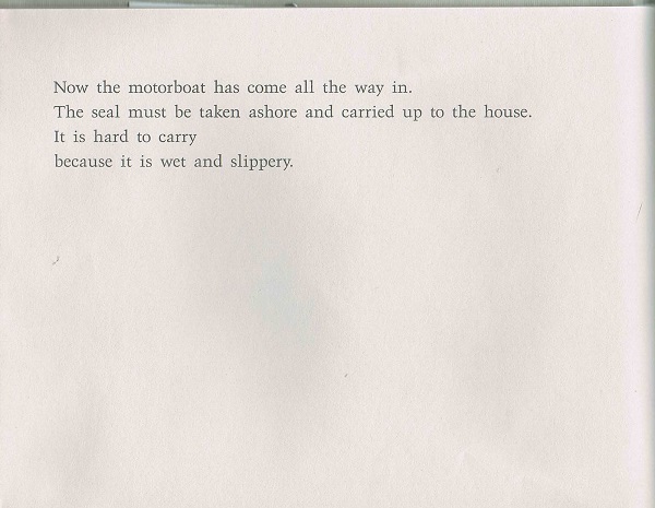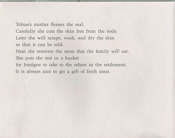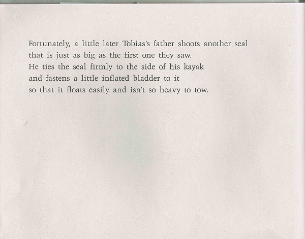 Holly: I see what Submitter is saying. There is a segment of the population that will be horrified that the seal is killed and flensed (skinned. I googled it. That’s quite a word for a children’s book!) and eaten, and the steps are told and shown in detail. The dead seal floats next to the boat, they have trouble carrying it to shore because it is slippery and wet, and the Mom is shown slicing into its belly with a knife.