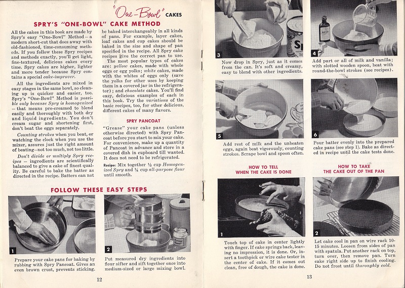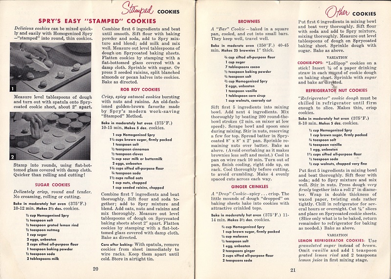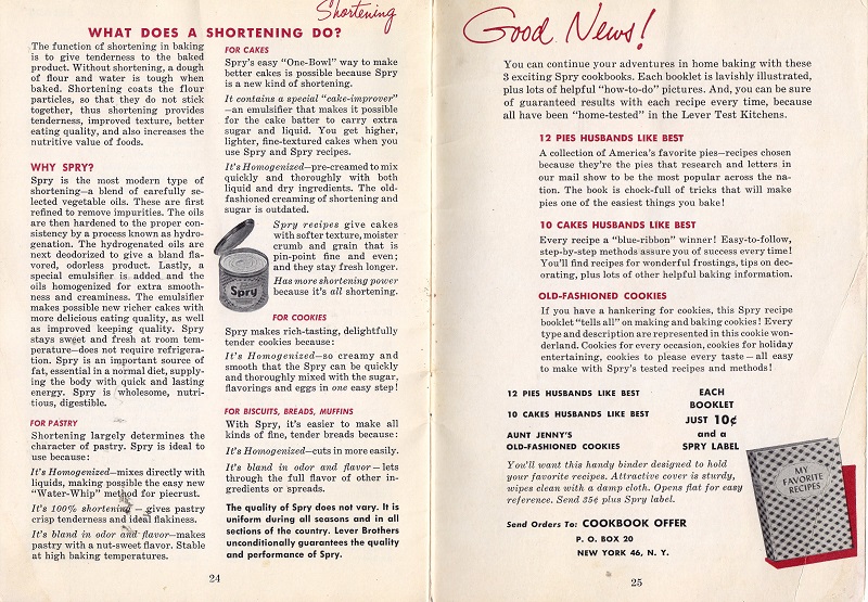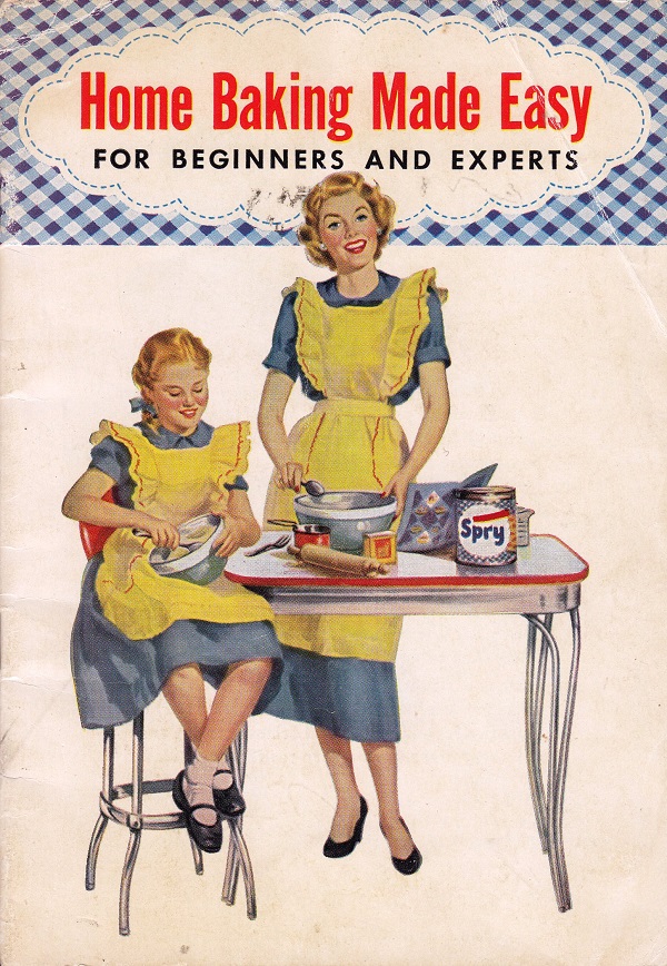This small cookbook is a delightful homage to the 1950s. Note the fashionable matching aprons on the cover. This is more pamphlet than book and was probably a give-a-way back in the day. Spry is the brand name of shortening that was the main competitor to Proctor and Gamble’s Crisco. In the USA, it was more or less gone by the late 1960s. My mom remembers this as a staple in growing up. We featured another Spry book back in the day. Click here to see that post.