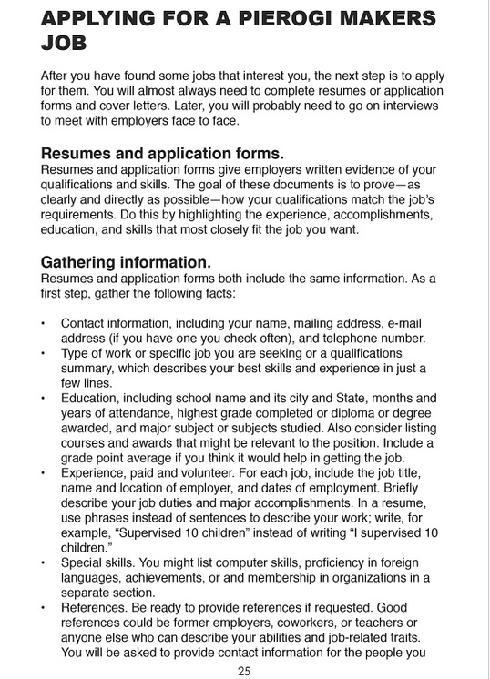 The contents of this book are very generic, and could apply to just about any job: what to put on your resume, where to search for jobs ads, how to list references, etc. All good advice. I just can’t get past the idea that you can get a top-paying pierogi makers job. It’s so specific! Someone please tell me that pierogi making is considered specialized and highly sought-after. Or maybe they’re trendy like cupcakes? Do people have high-end pierogi shops? WHY ISN’T THERE ONE IN MY NEIGHBORHOOD?