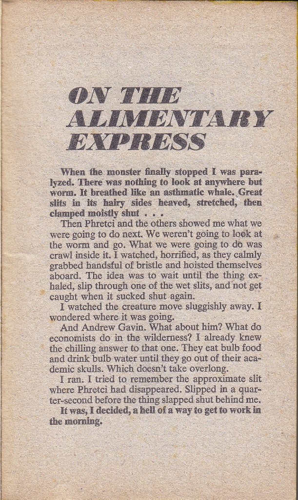 I have no words for this cover. Naturally, I had to have this book after seeing the cover. I don’t even care what this is about. Sci Fi from the old days usually has some of the most bizarre cover art. From the book’s description I am guessing that the phallic looking “thing” is called the wormway or rather a subway for this bizarre alien culture. I will leave it to you all to come up with your own jokes for this cover.