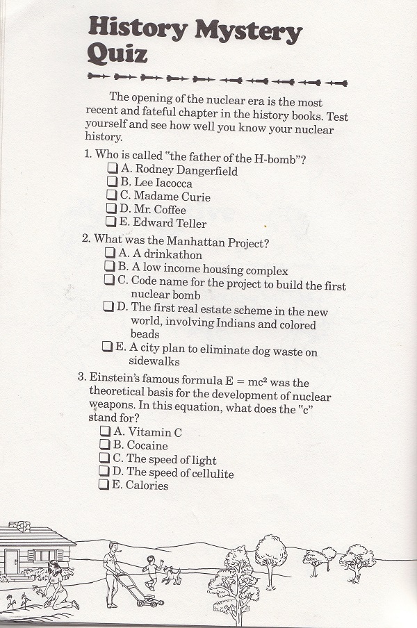 Didn’t have any cool fiction to share this week, but I did find this in my pile of weird books. I really didn’t expect to find this book still hanging around in a library, but I was wrong. WorldCat has a bunch of holdings and many are in public libraries. This humor book is certainly a product of the time. I was of the generation that hid under school desks in order to avoid The Bomb. This cracks me up. After you survive the atomic bomb from this book, you can get all your post nuclear holocaust activities and fun in this one.
