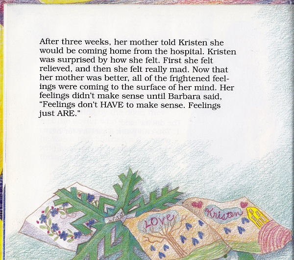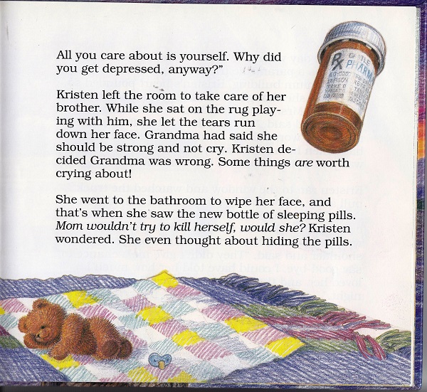 This time, our favorite author tackles depression. Our protagonist, Kristen is watching Mom slide into a very dark place. Evidently Dad left, Mom lost her job, and the baby is crying. Poor Kristen is left to hold everything together. Mom attempts suicide and is hospitalized. Kristen is confused. The doctor fixes everything and they all go home. I wonder if he also helped her get a job and find Dad?