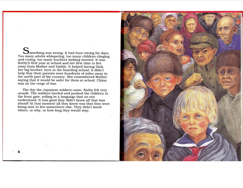 Our brave children Kathy and Dick are some how caught up in what I think is the 2nd Sino-Japanese War. Who are these people? Where were the parents? I wasn’t even sure it was the 20th century until the end when the Americans came in a plane to rescue the camp.