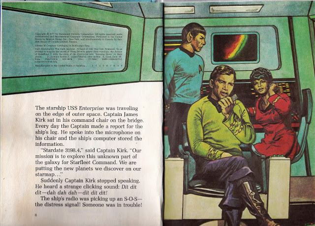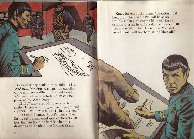 This book reads like an episode, and the pictures do look like the characters. However, I am not sure that I am the target market for the juvenile fiction section of a library. (I know a hundred adults that would get a kick out of this in a heartbeat.) Note the illustration where Mr. Spock breaks out PENCIL AND PAPER to draw up some plans!