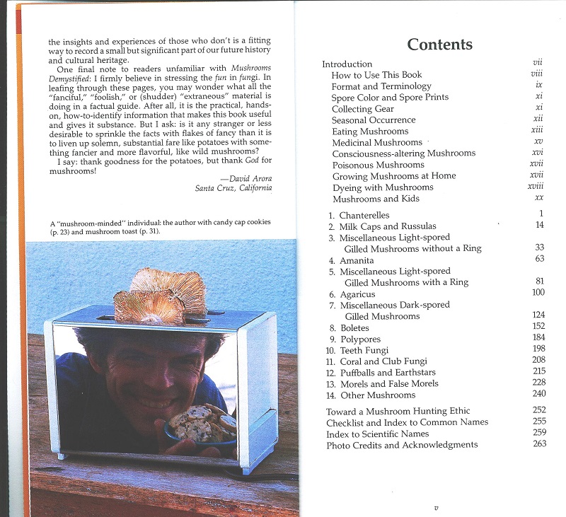 Submitter: I saw this cover and burst out laughing, a man dressed in a tuxedo carrying a trombone while searching for mushrooms in the wilderness with a crazy grin on his face. What is not to love? The second .jpg [below] is a completely different man dressed as a tree, complete with bark outfit… a lot of strange men hanging out in these woods. Third .jpg [below] is the man again, his image reflected in the shiny surface of a toaster that just happens to be toasting a couple of mushrooms. Apparently, this book is quite a useful resource for mushroom seekers, but I imagine that most people won’t get past the cover. .