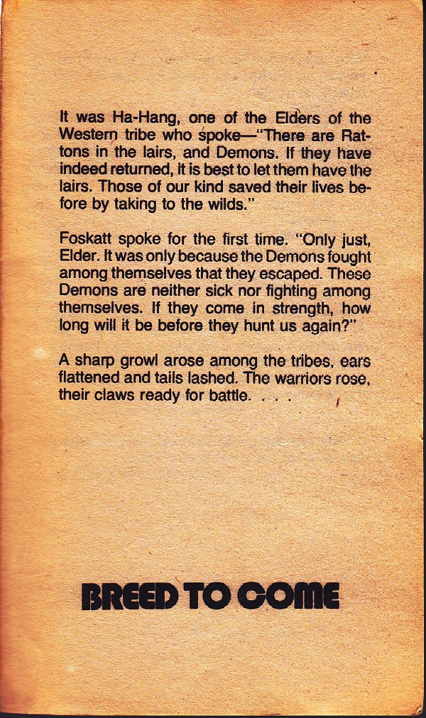 This particular title, set in the future, examines the aftermath of a planetary disaster involving a devastating virus. Leaving behind a ruined planet, humans took off for greener pastures. In the mess of what was left, a band of cats evolved into a complex, intelligent society. The humans, referred to as the Demons, have now returned. What will happen to this society and the peaceful earth now that the humans have returned?