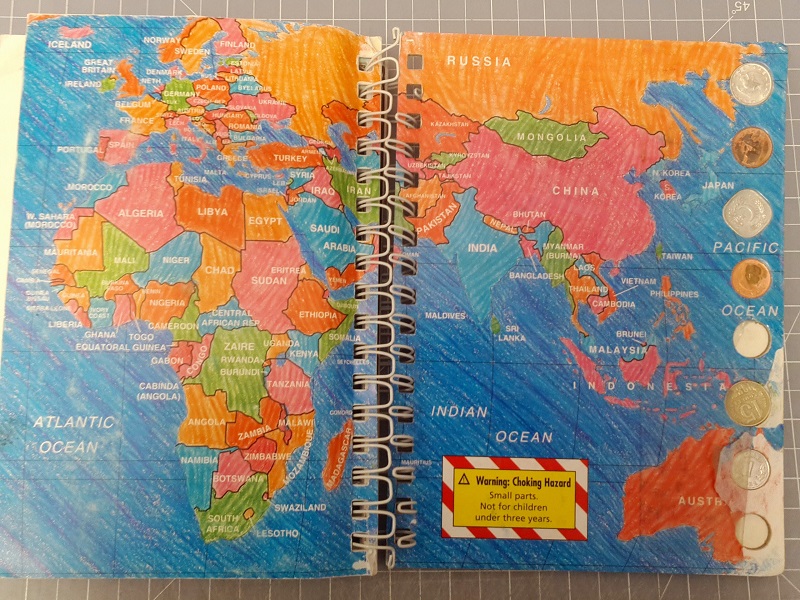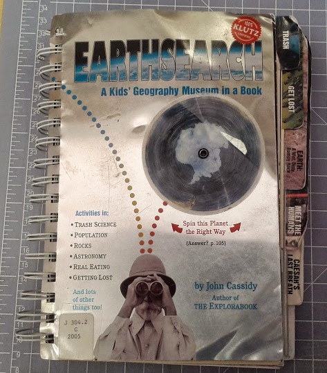Submitter: This book is a fun hands on exploration of the earth’s geography. The book has been well used and loved based on its current state. There are several things that make this an awful library book. The first are the removable coins in the back cover. There was an attempt to keep the coins contained with the addition of tape, but clearly that didn’t work very well. Where did those two missing coins go? This book was shelved on a bottom shelf within easy reach of toddlers, so a definite safety hazard. The rice has most likely gone rancid and would make a child sick if eaten. Wrinkled pages and pages that are pulling away from the spiral binding…it’s time to go.