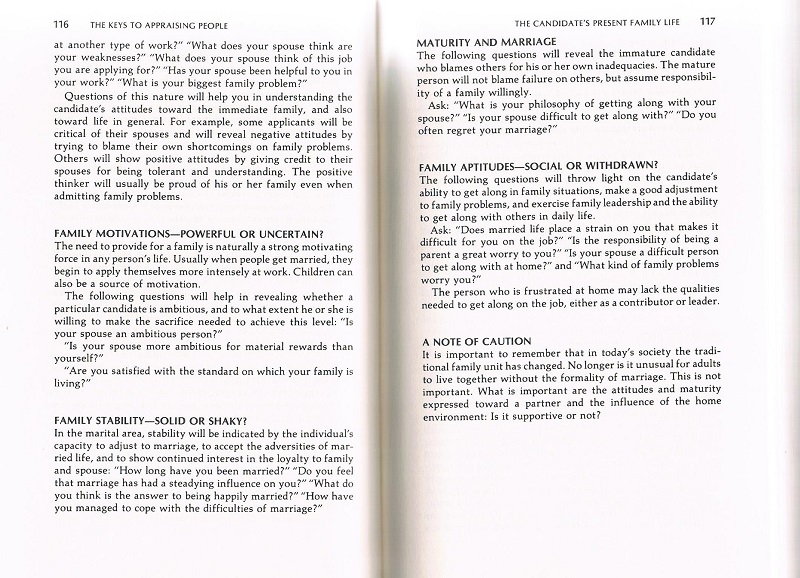 Submitter: I recently weeded this from the public library where I work. The majority of the book consists of suggested interview questions that managers can ask to assess job applicants’ “hidden qualities”. However, many of the questions would probably land an interviewer in hot water these days.