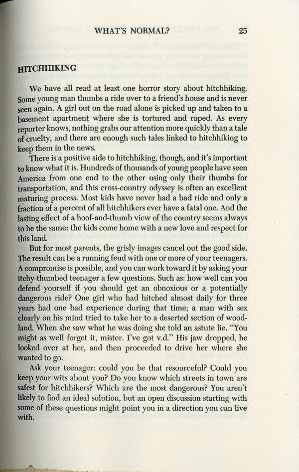 Holly: The section on hitchhiking (below) seems ridiculous. Do kids today even think about “seeing America” by hitchhiking from one end to the other? I doubt it. Sure, we need to tell kids that hitchhiking is not a good idea, but this makes it sound almost like the parents are overreacting and it’s not such a bad thing as long as kids are aware of the risks. I like the open dialogue method, but I wonder what else the author suggests compromising on. Was this how kids were raised in the 70s? Mary?