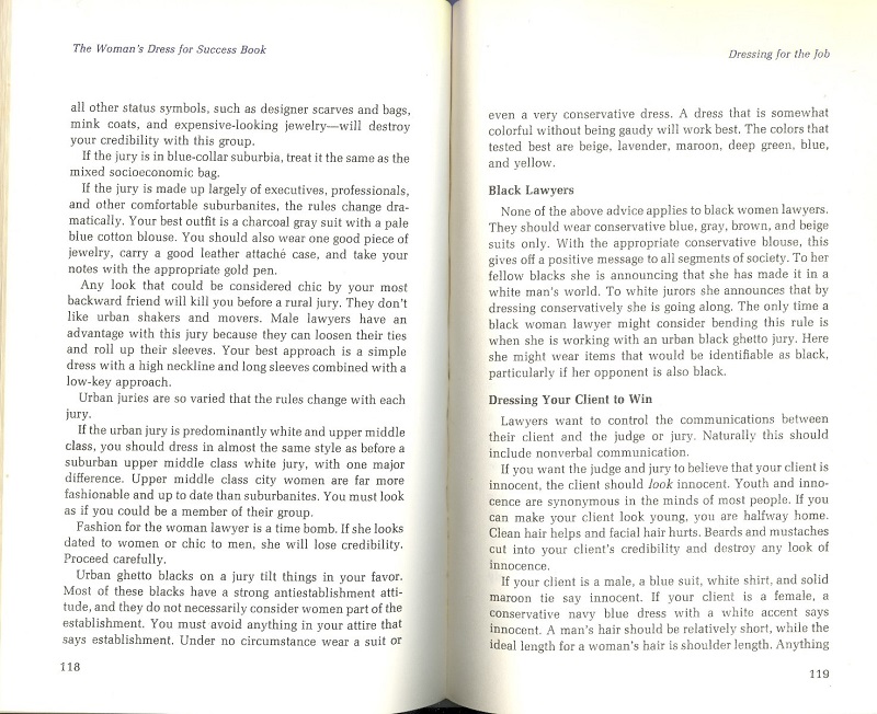 The attached photos include some of my very favorite sections, including the intro titled “Bedroom or Boardroom-Your Choice”, a wonderful illustration of a “Don’t” workplace outfit, a section explaining how black women lawyers should dress for optimum impact on white men and black men, and an intro to the section on attracting a nouveau riche man.