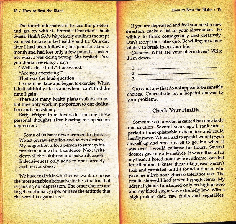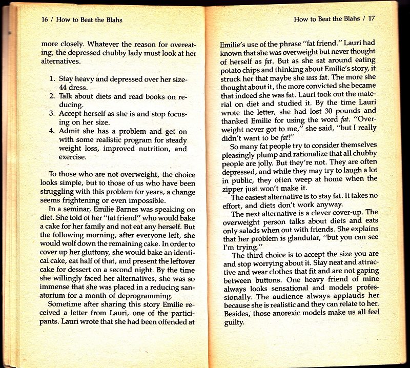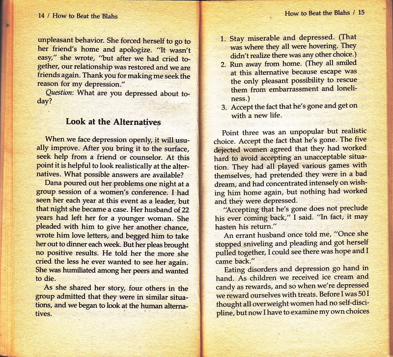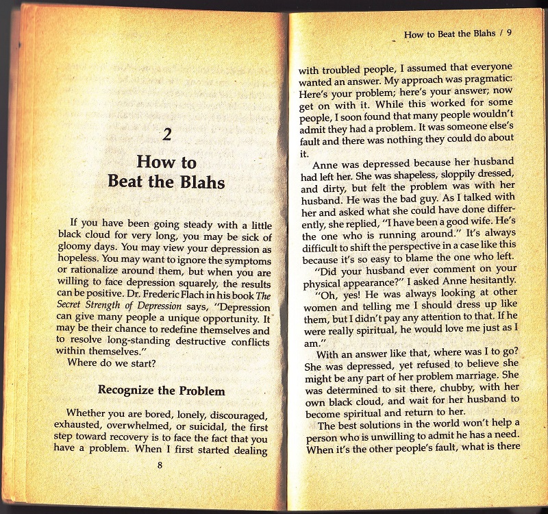 As a long sufferer of the “blahs”, this book is beyond awful. For the time, this was probably how most folks thought about depression. Basically, with a little lipstick and a new outfit, you can beat depression. You just need to grab those bootstraps and pull your self up!