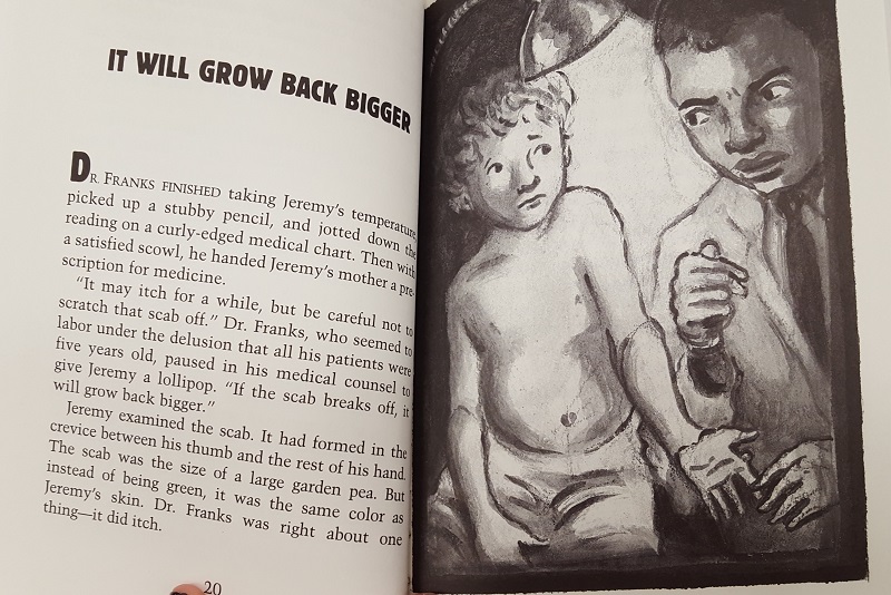 Submitter: There are so many things going on with this book…a kid with dinosaur hands, horrible writing, crazy chapter titles, and the illustrations! The worst part is that we have TWO copies of it in our Library! Apparently the previous Librarian enjoyed it so much she ordered a second copy. From a middle school library.