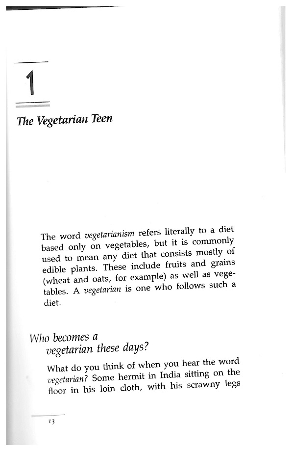 Holly: I wish Submitter had included page 14 (below) because I want to see how that paragraph ends. A loin-clothed Indian hermit? Really? Vegetarianism is much more popular and mainstream now than it was even in 1991, so I doubt that’s what teens think of when they hear the word “vegetarian.” Also, what the heck are those things on the cover? Squashes? White eggplants? This is a very bizarre cover! It is cut off, and the full-length image is on Amazon, but this is still pretty odd.
