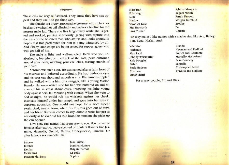 I am particularly happy that the author was kind enough to give a category for “sexpot” names. Given the choices of Veronica Lake or Jane Russell dates this book even for the 1980s.
