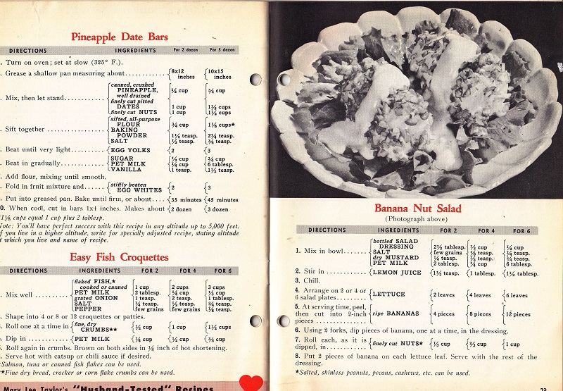 The recipes don’t look too bad if you ignore the icky black and white photos. I am going to say no to the funky looking banana nut salad.