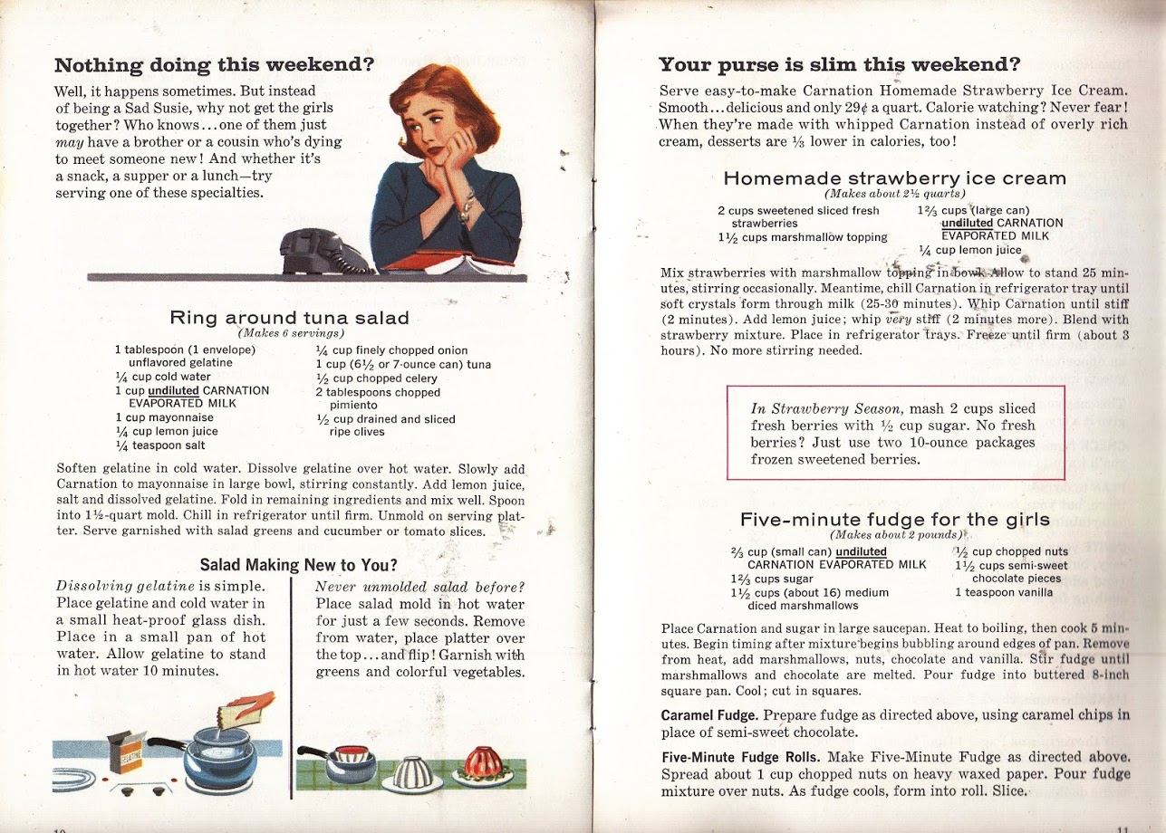 Want to be one of the cool kids? Break out the apron and you can be popular and throw the perfect party with help from this little book. Naturally, Sad Susie is totally unpopular with the boys, but she can at least get her girlfriends together and throw a little party. One of those girls might have a cute brother or cousin and with your cooking skills you might be able to snag a new boyfriend. Naturally, we have a molded tuna salad recipe with gelatin to make sure you can properly “shape” your food. I am sure this recipe is a sure bet for attracting a man.
