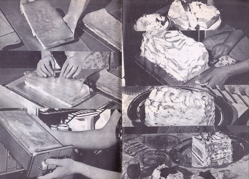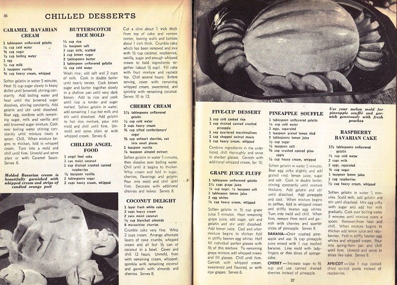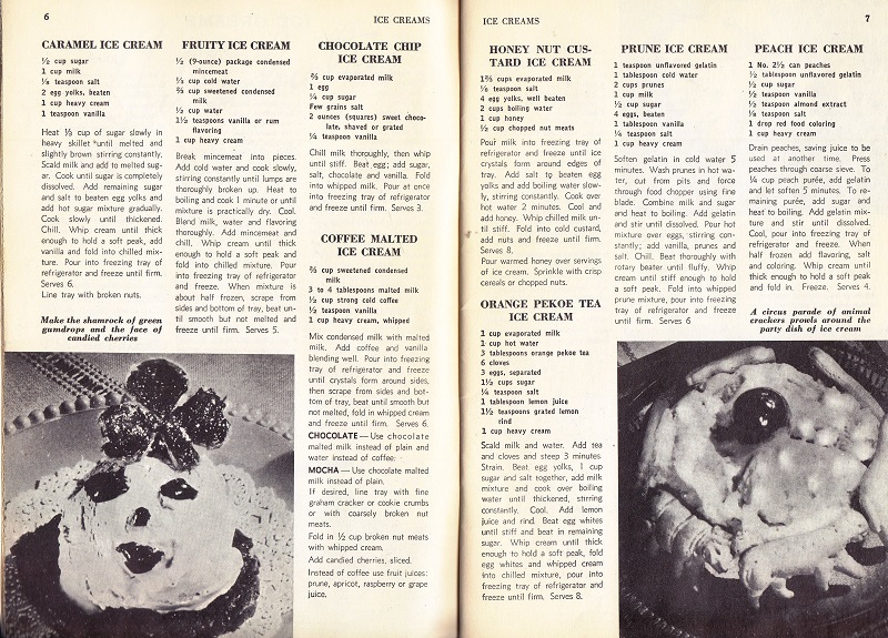 For those of you with a sweet tooth, here is your source for all sorts of treats that use your fridge/freezer. Of course there are recipes for ice cream, Baked Alaskas, cookies, pies and puddings. Unfortunately, the black and white photography doesn’t really help with appeal factors. The cover shot is ice cream, in case you didn’t recognize the food. (I had to look several times to be sure). However, if you like your food with a creepy face, check out the second picture after the text.