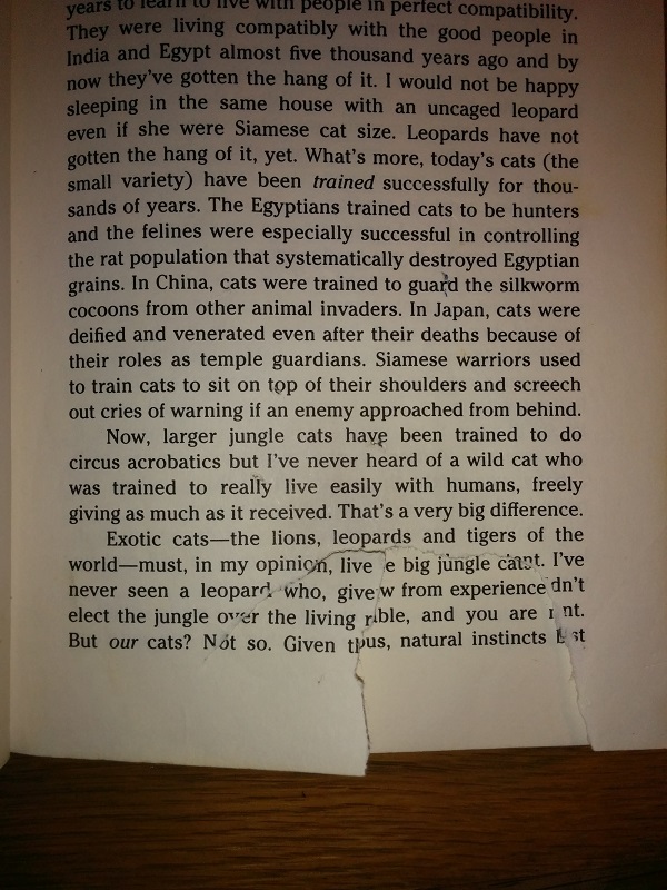 Submitter: First of all, 1985. Cover, design, everything is old-fashioned and faded. Second, training your cat to come when called? If you want a dog, get a dog. And finally… doesn’t seem like the program worked on at least one cat. Page 7 is not only clawed up but missing a big chunk. It’s a weeder!