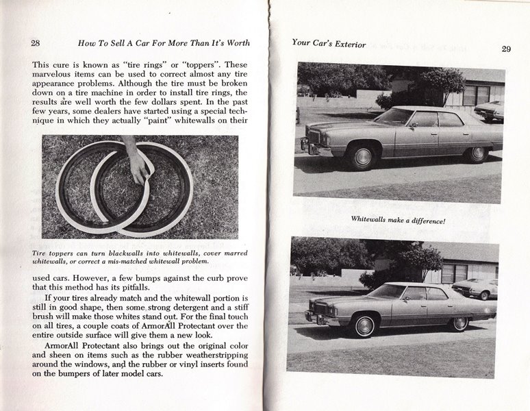 Not a bad book for the times. The advice is pretty basic and sensible from what I can see. Advice on cleaning, detailing and minor repairs is probably still relevant but selling cars on your own is quite different with the advent of the Internet. I kept thinking that no amount of help from this book would be able to get you anything on some of the those spectacular examples of automotive design, such as the AMC Pacer, Chevy Vega and the Ford Pinto. One of my pals from college had a “lovely” Ford Pinto that was on its last legs and she insisted it was not going to explode. I think this particular car died sometime around 1983 and is probably a hunk of rust in a landfill in central Illinois.