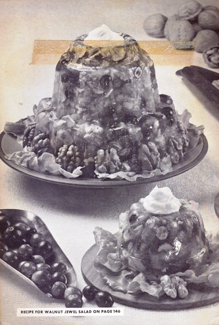 Without a doubt, molded food was quite the trend from the late 1950s through the 1970s. My mom still has a collection of molds and I know I was given my share when I got married in the early 1980s. I don’t mind the basic sweet jello from my childhood, but I will draw the line at the molded beet and cabbage salad featured in the 3rd picture below. It’s so wrong on so many levels.