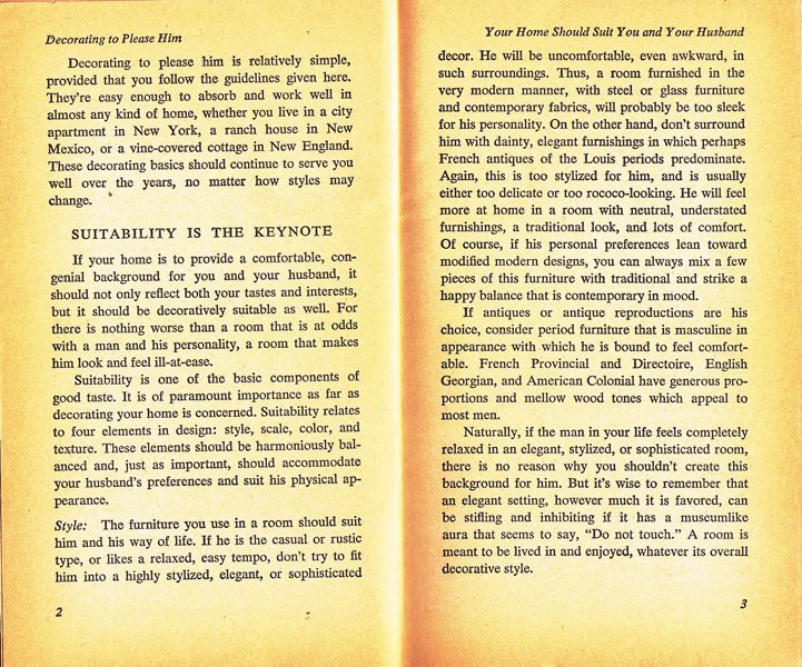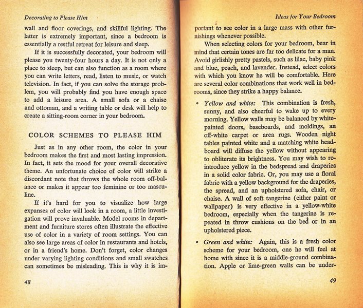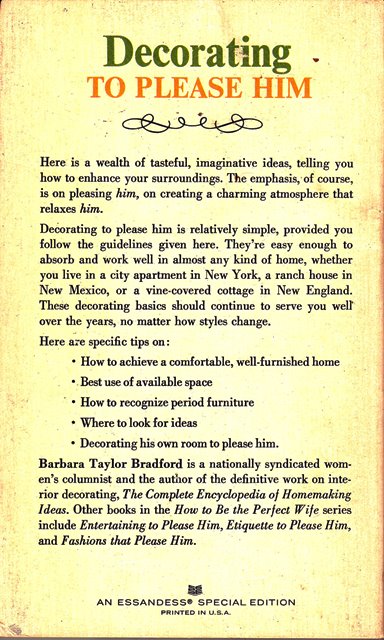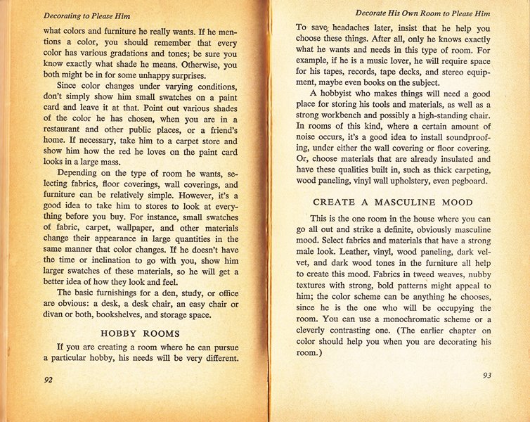 We are back with another Barbara Taylor Bradford decorating book from the How to be a Perfect Wife series. Make sure you click here for another book in the series. Obviously, being a perfect wife take many books. Barbara has all the advice for you ladies trying to “please” your husband. Evidently, it is your job to make sure the decorating suits his needs. There is a ton of advice to make sure you have manly looking space for him and not overwhelm him with too much femininity in your decorating. He needs a “charming atmosphere that relaxes him”. I think Barbara needs to stick to fiction.