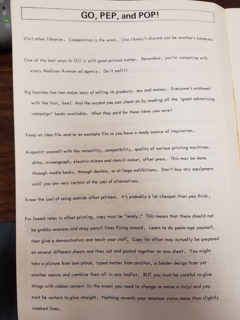 Holly: The sample suggestion card (first image below) is fantastic. At first I thought an actual patron wrote in the book and the staff responded, but it’s just a sample (the authors’ names are in the response). Some of the ideas in the book aren’t bad. Others, like “Acquaint yourself with…various printing machines: ditto, mimeograph, electric mimeo and stencil maker, offset press” are horribly outdated.