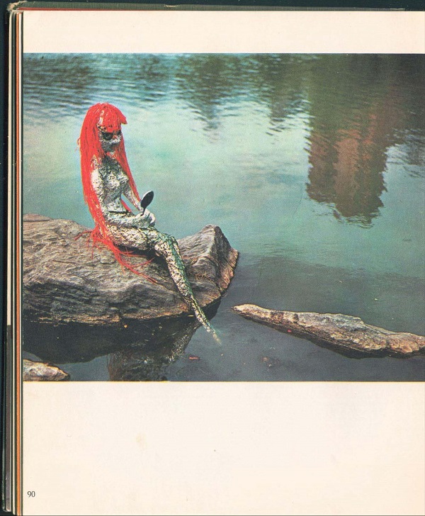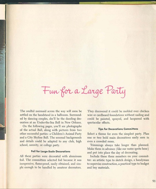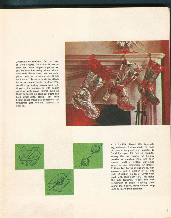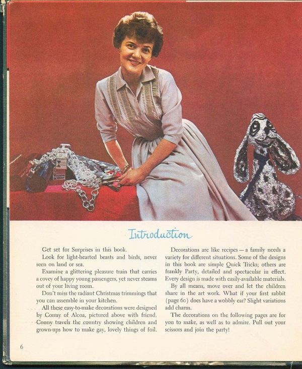 Submitter: I can’t decide what I love most about this book — there is just too much awesome awfulness to choose from! From “Conny of Alcoa” (is that like Saul of Tarsus?) perched on the edge of the table in her smart 50’s shirt dress to the scarlet-haired beauty dipping her foiled toes in the water on page 90, this book is a gem. Glue together foil boots to hold lingerie at Christmas! (And don’t forget to invite your guests to “snip nuts to learn their fortunes.”) Hang foil donuts on your front door to impress the neighbors! Mound crushed foil up and stack fruit on it! Dress your son up as a mind control-foiling (yuk-yuk) Pippi Longstocking for Halloween! (Although the aliens may have already gotten him — notice the childish attempt at a Vulcan salute)