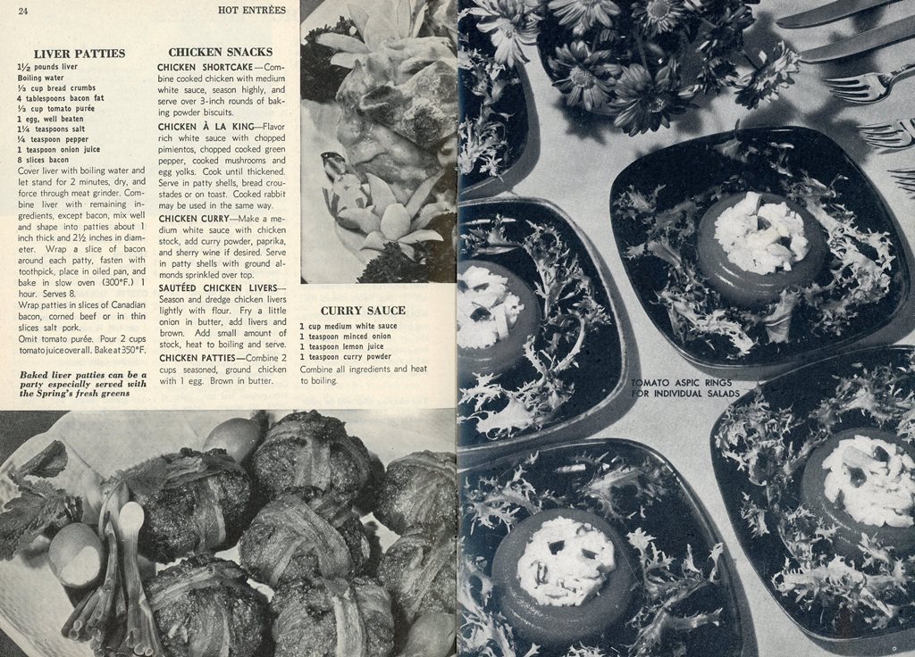 I think a good rule of thumb for cookbooks is that one should be able to identify the food pictured. Some of these old cookbooks seem to delight in NOT looking like something edible. Anyway, as we approach the holiday weekend, I am sure you will want to run, not walk, to the store and make some of these delightful treats for your 4th of July party. I am sure your guests will be delighted with hard-cooked eggs in jellied bouillon or jelled salmon.