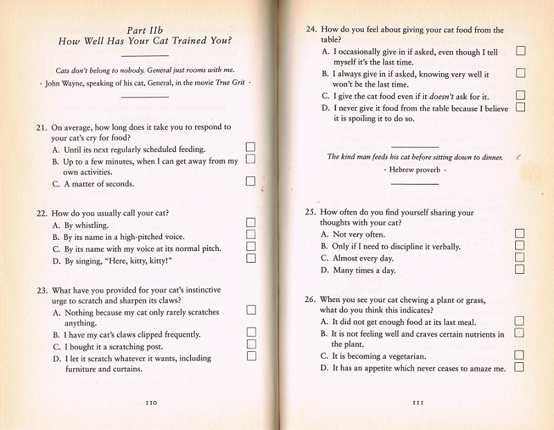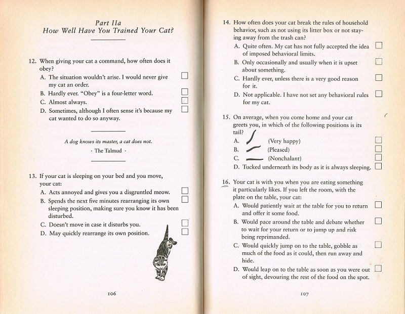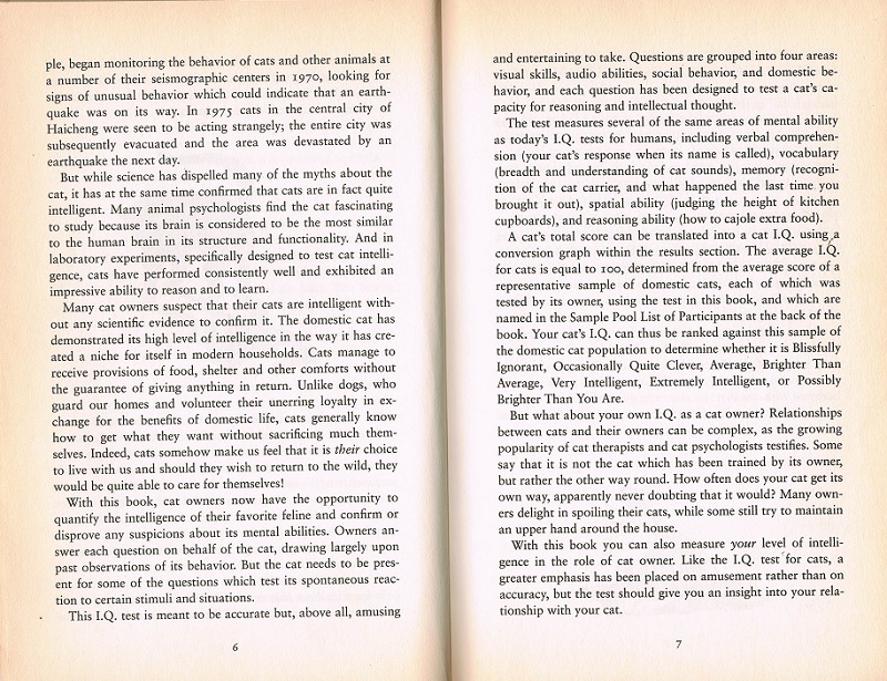 The idea that some animals are generally more intelligent than others is nothing new, and I can even get on board with the idea that like people, some cats are more intelligent than other cats. I can even think of specific people who would take the time and trouble to score their cat’s IQ. There is definitely an audience for this book, and the public library in which it was found is even a reasonable place for it.